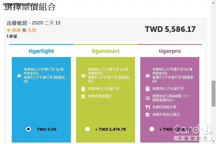 4.選擇想要的票價組合,小編也特別提醒大家台灣虎航和捷星的手提行李重量限額是不同的喔!