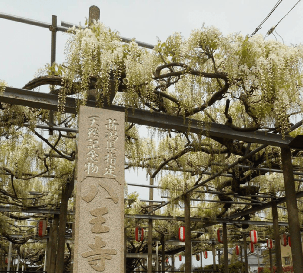 不同於其他紫藤名勝,八王寺以白藤闖出名號,寺內的明星白藤已經有將近350年的年齡,甚至在昭和33年被列為當地新瀉縣的文化遺產。如果紫藤象徵的是夢幻和豔麗,白藤則有一種靜謐女神的優雅感,讓人會想慢慢靠近,細細欣賞她的美。