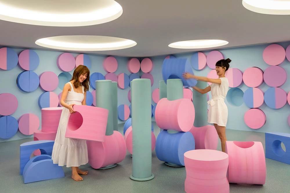 以圓形泡泡貫穿的主題美學遊戲空間,以粉色連貫且錯落的虛實積木做為牆面,可以親自動手組合排列巨大立體圈叉遊戲。