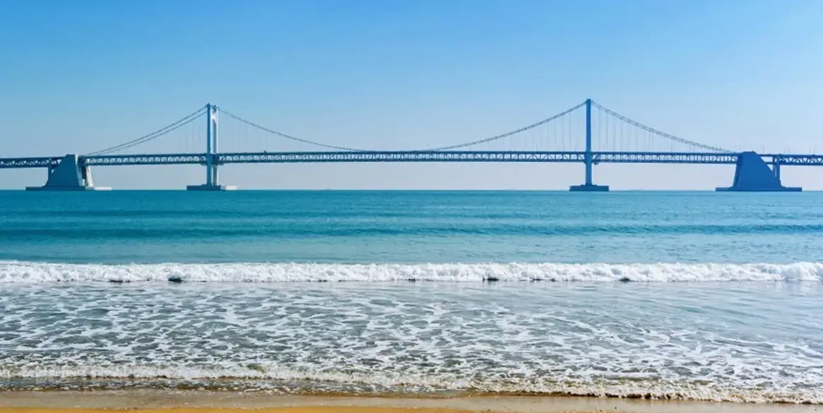 有「鑽石橋」之稱的廣安大橋,當夜晚來臨,橋上的所有夜燈亮起,讓看過的人都說美,晚上的廣安里海水浴場可是釜山知名的夜景處,但白天的廣安里海水浴場景色也別有一番風味唷!