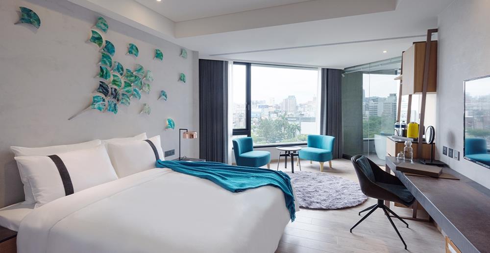 位在人文薈萃的台中草悟道商圈的「台中大毅老爺行旅」,以獨特幾何圖形融滙通透大片玻璃來設計出各種不同角度的菱形觀景方框,十分大膽卻也能感受到住宿質感中的時尚潮流風格,深受文青旅客和年輕族群的喜愛。客房均以簡潔白色為主軸貫穿室內,方正溫暖的格局與大片景觀窗,讓身處室內也能自在享受自然採光,對於不善出門的情人而言,也能欣賞城市天光與新舊交疊的台中景觀。