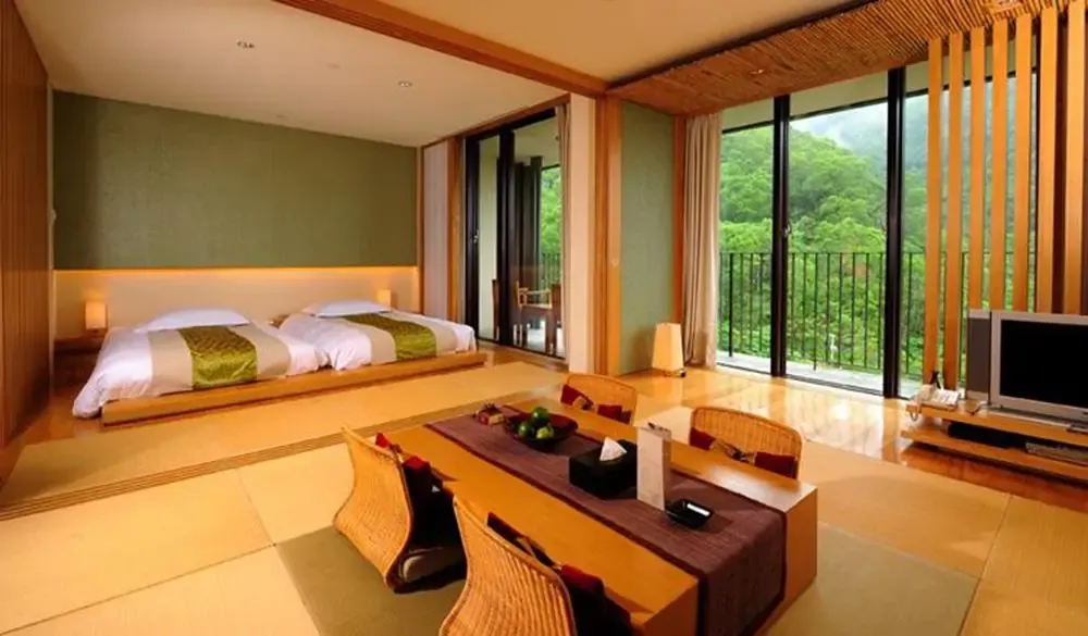 中西式的合併,帶有洋式雙床與和式榻榻米的套房,巧妙地利用拉門來隔出兩個獨立空間,不僅有日式道地的樸質風情,也有舒適寬闊的現代化空間。而陽台設計更是一絕,房客透過露台圍欄與山林對話,沉浸在自然微風的親撫中,使這趟旅程總是酣甜入睡。