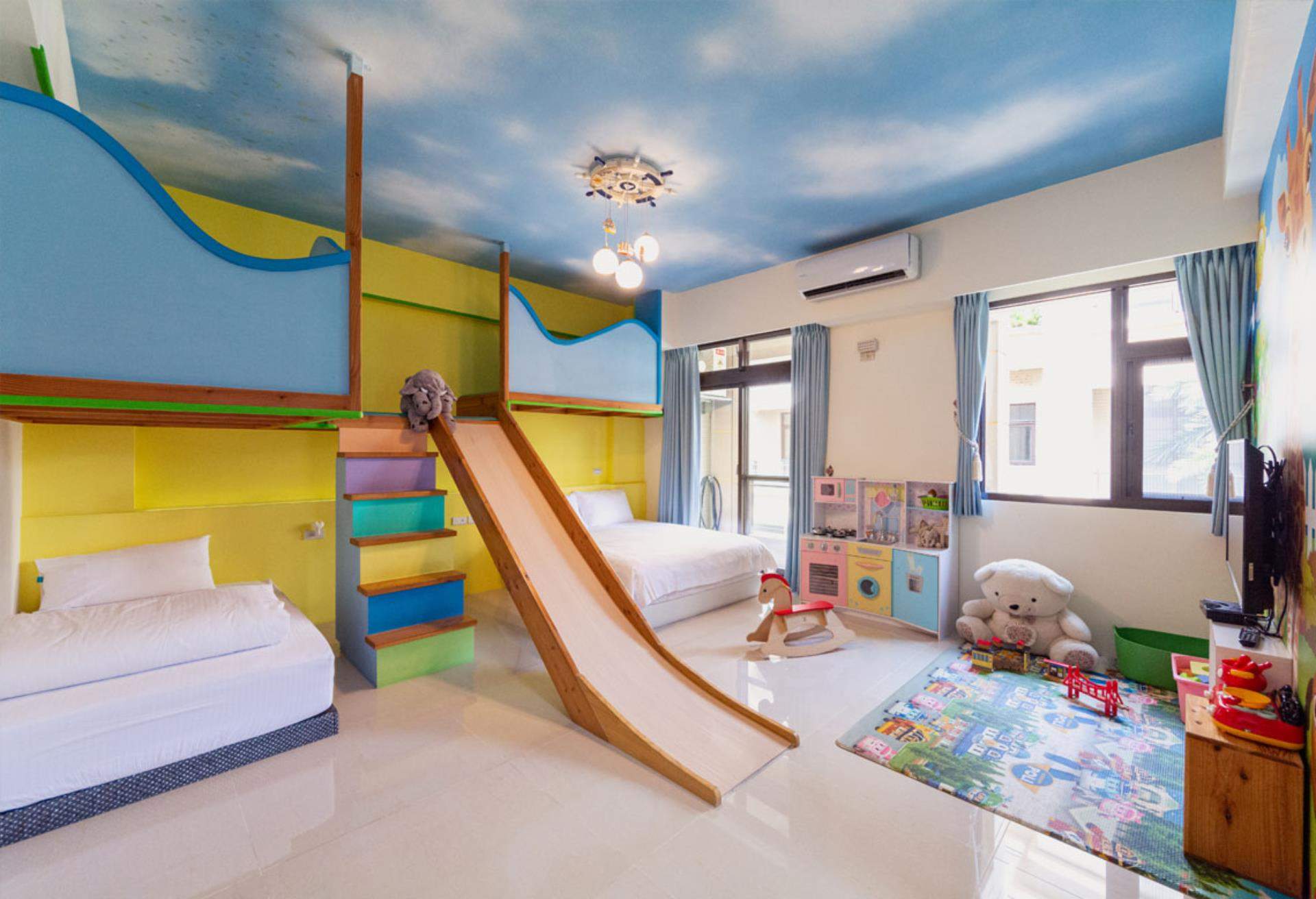 - 民宿規劃雙人房及多樣化有趣的親子主題套房, 雙人套房佈置簡潔優雅,而親子套房內則有藍天白雲彩繪和好玩的溜滑梯