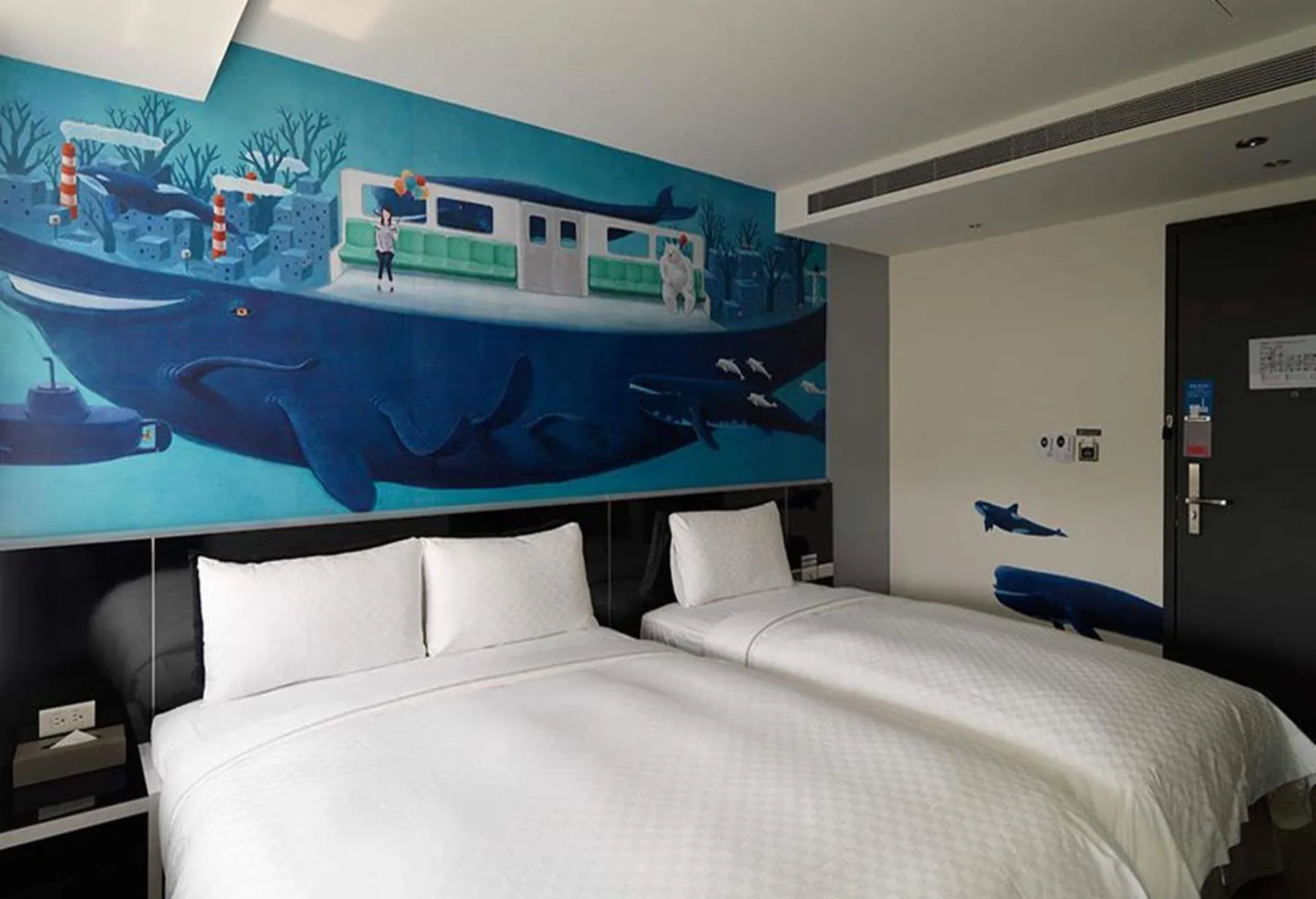 「新驛旅店台中車站店」地處台中最重要交通樞紐台中火車站旁,一幢簡約的旅店,裡頭卻暗藏許多驚喜之處!新驛旅店台中車站店特別邀請到台灣新銳的插畫家與平面設計師,在公共區域及部份房型內,施以令人耳目一新的插畫及大膽色彩,在設計感與時尚感兼具的住宿環境下,帶著孩子入住,不僅能激活孩子對色彩的敏感度,也能激發腦中的藝術創意!