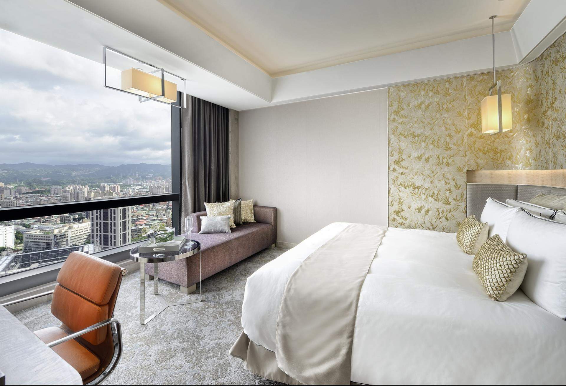 - 客房以湖水綠、海洋藍及陽光金做為主色系,搭載柔和燈光與木質傢俱,在大面積景觀玻璃窗下的則是城市美景